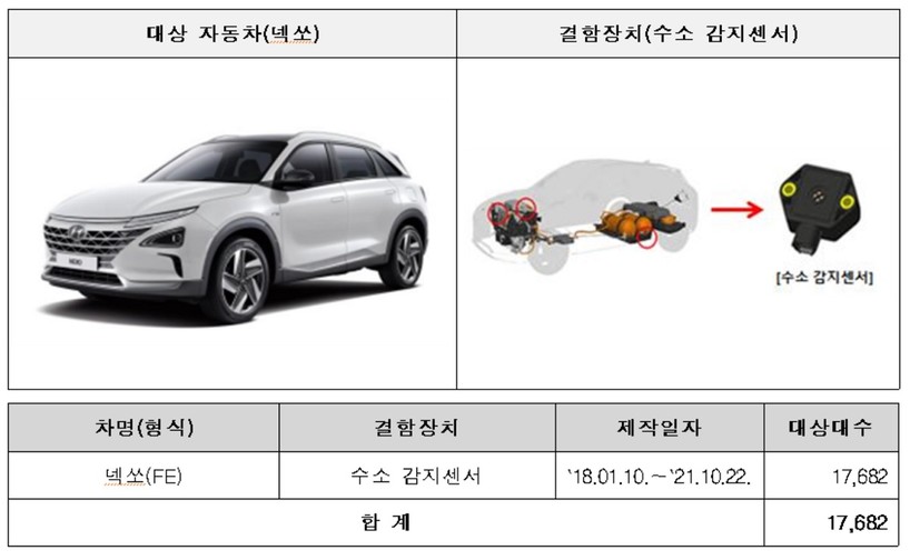 현대자동차의 넥쏘 1만7682대는 수소 감지센서의 성능 저하로 수소가스 누출 시 경고등이 점등되지 않아 안전에 지장을 줄 가능성이 확인됐다.