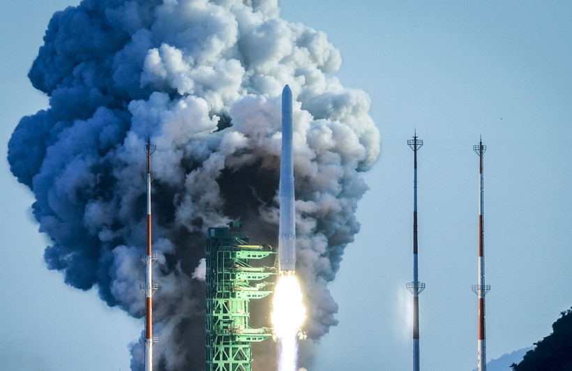 | ▲2021년 10월 21일 전남 고흥 나로우주센터 연구동에서 한국형 발사체 '누리호(KSLV-2)'가 발사되고 있다.(사진=newsis) |