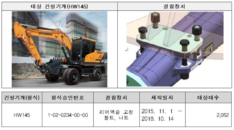 2일 국토교통부에 따르면 현대건설기계의 굴착기(HW145) 2062대는 하부 프레임과 차축을 고정하는 볼트·너트가 풀려 작업 안전이 저해될 가능성이 확인돼 리콜에 들어간다.