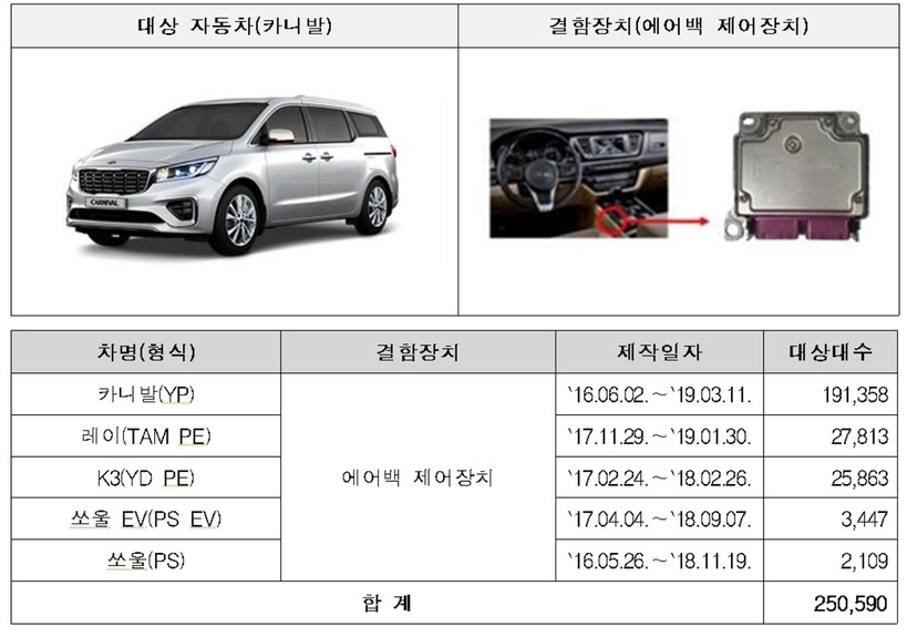 10일 국토교통부에 따르면 우선 기아의 카니발 등 5개 차종 25만 590대는 에어백 제어장치 제조 불량으로 충돌 시 에어백이 작동되지 않을 가능성이 나타났다.
