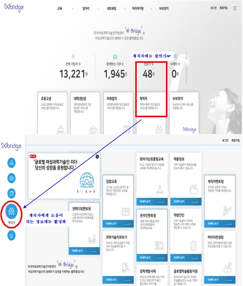 W-브릿지는 기존에 미취업‧경력단절 여성과기인을 위주로 지원하던 취업포털 ‘WE두드림’을 초중등, 대학(원), 재직‧경력단절, 은퇴 여성과기인 모두의 성장을 지원하는 통합 플랫폼으로 확대 개편한 것이다.