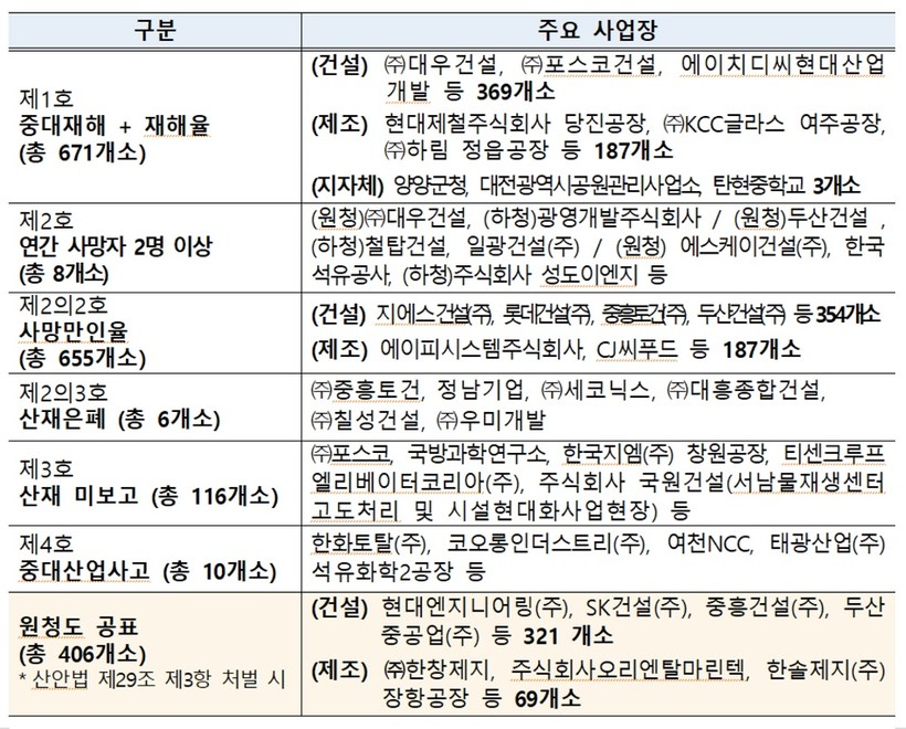또 수급인 근로자에 대한 안전·보건 조치 의무 위반으로 처벌받은 SK건설 등 406개 도급인 사업장도 공표대상에 포함됐다.