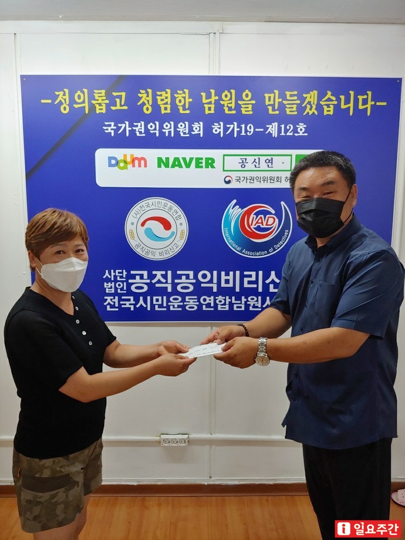 [일요주간 = 이태곤 기자] 사)공직공익비리신고 전국시민운동연합 남원시지부 (지부장이태곤)에 따르면 대강면 사석마을에 살고 있는 박기성.지영화 집에 최근 전기누전으로 추정되는 화재 사건으로 큰 피해를 입은 지영화씨에게 위로금 2.500.000만원 전달 하였다고 밝혔다.