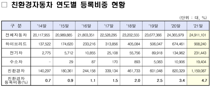 2021년말 전기차는 전년대비 71.5%(+9만 6481대)증가해 총 23만 1443대가 누적등록됐으며, 2018년말 대비 4.2배로 증가한 것으로 나타났다.