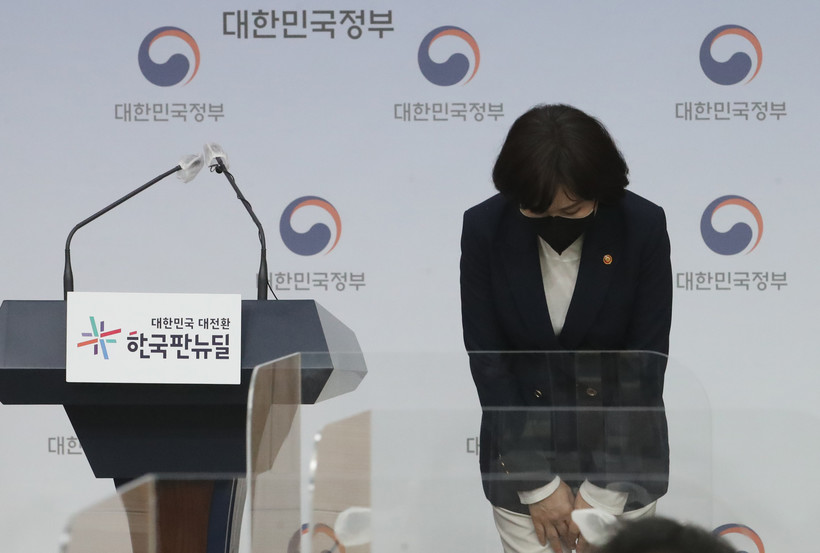 | ▲ 전현희 국민권익위원장이 지난 3월 서울 종로구 정부서울청사 별관 합동브리핑룸에서 열린 이해충돌방지법 제정 등 공공기관 반부패·청렴 강화 대책 브리핑에서 LH 투기 의혹 관련해 사과하고 있다. (사진=뉴시스) |