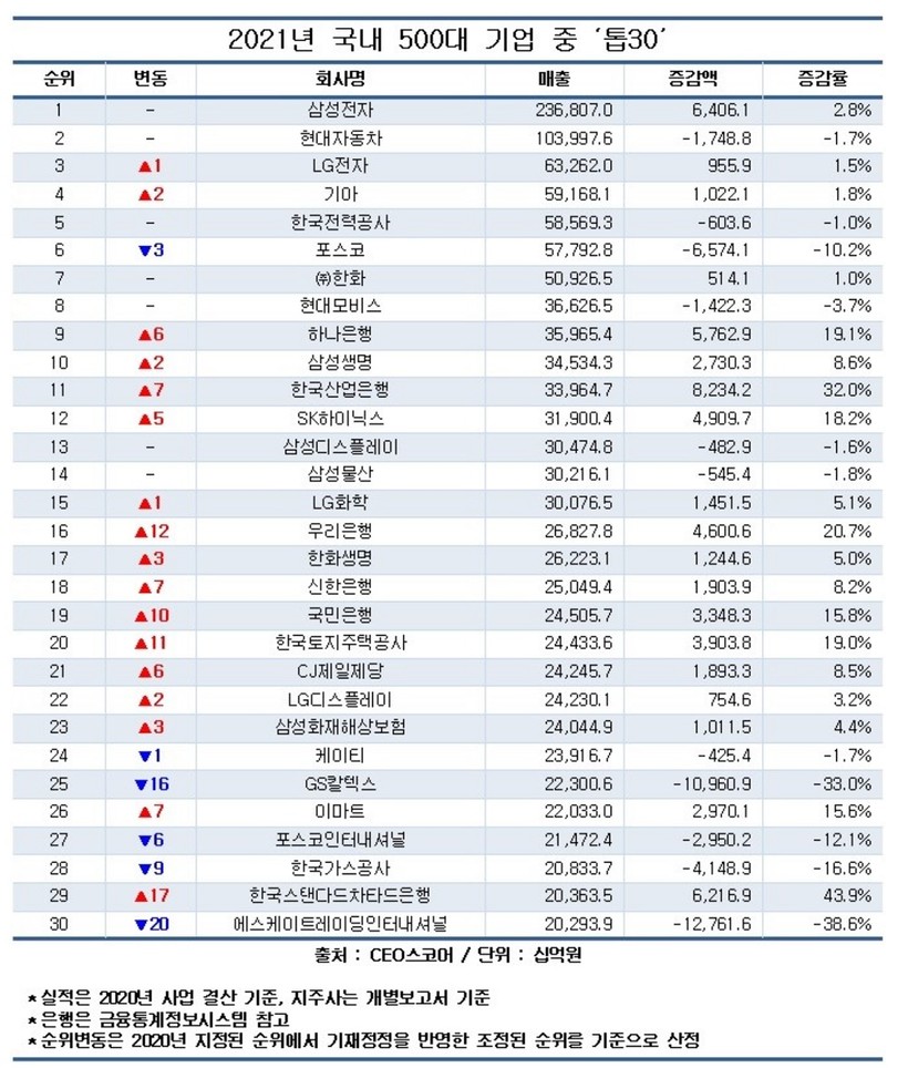 기업평가사이트 CEO스코어가 금융감독원·금융통계정보시스템·공공기관과 지방공공기관경영정보공개시스템에 재무정보를 공개한 국내 3만800개 기업을 대상으로 2020년 매출액(연결기준·지주사는 개별) 기준 국내 500대 기업을 선정한 결과, 전년과 비교해 44곳이 새롭게 순위에 진입했다.