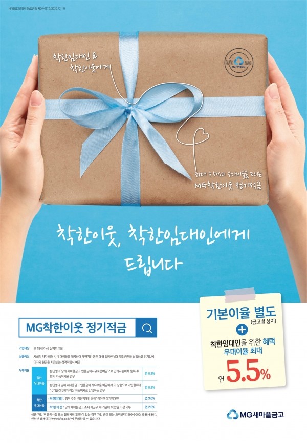 24일 새마을금고에 따르면 코로나19 위기상황 극복에 기여하기 위해 ‘MG착한이웃 정기적금’을 12월 21일 출시했다.