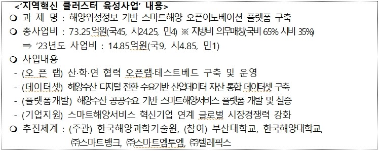 산업통상자원부의 ‘지역 혁신 클러스터 육성사업’에서 부산은 ‘해양 정보통신기술(ICT) 융합’ 분야 사업을 담당한다.