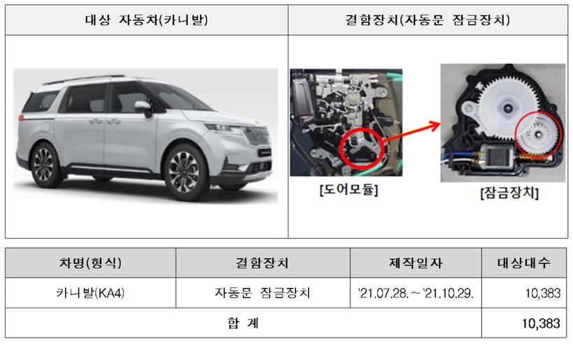 기아 카니발 1만383대는 우측 자동문 잠금장치의 내부 부품 제조 불량으로 차량 문이 불완전하게 닫혀 주행 중 문이 열려 탑승자가 상해를 입을 가능성이 있었다.