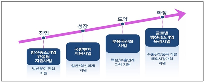 주요 업무를 보면 우선 중소·벤처기업의 전순기에 대한 지원을 강화한다. 컨설팅 지원 사업을 통해 방산 진입을 촉진하고 성장·도약이 필요한 기업에 국방벤처 지원 사업과 국산화 사업을 통한 기술력 향상, 사업화를 지원할 예정이다. 글로벌 강소기업 육성사업을 통해 해외시장 확장·개척도 돕는다.