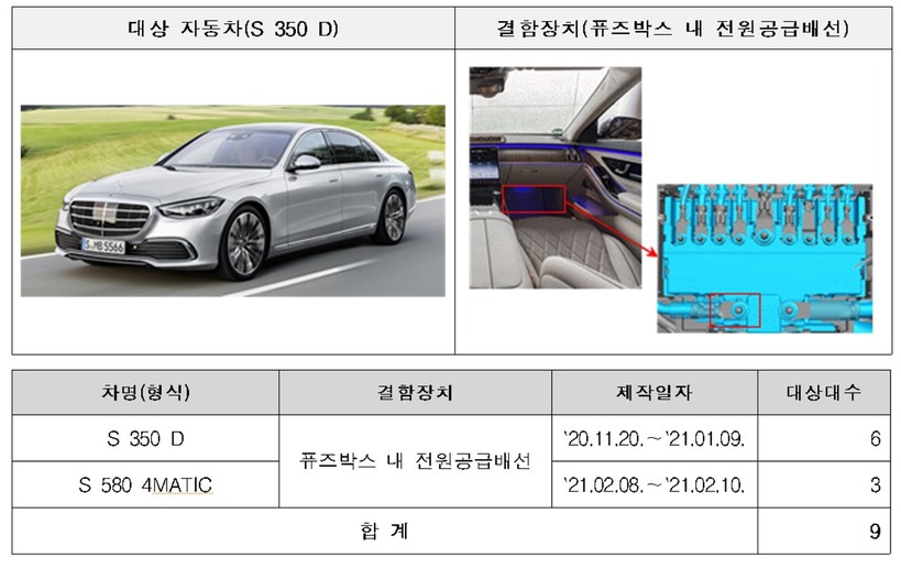 메르세데스벤츠코리아의 S 350 D 등 2개 차종 9대는 퓨즈 박스 내 전원공급배선의 접촉 불량으로 화재가 발생할 가능성이 있었다. S 580 4MATIC 등 4개 차종 6대(판매 이전)는 뒷좌석 중앙 머리지지대의 고정 불량으로 충돌 시 탑승자를 제대로 보호하지 못할 가능성이 나타났다.