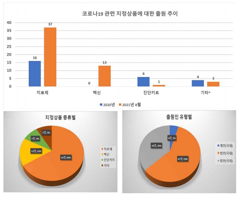 한편, 의약품 전체 출원 가운데 감염병과 관련된 백신, 면역조절제, 항바이러스제, 항체치료제, 혈장치료제를 지정상품으로 포함한 출원은 코로나를 기점으로 지난해 2019년 대비 66.9% 증가했다. 올해는 8월 말 현재 지난해 출원 건을 이미 넘었다.