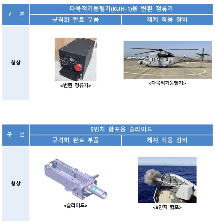 25일 방사청에 따르면 규격화한 부품 2종은 ▲다목적기동헬기(KUH-1)용 변환 정류기 ▲5인치 함포용 슬라이드다.