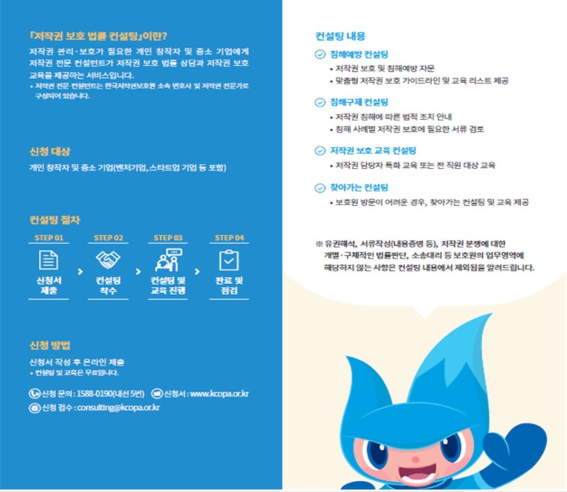 컨설팅 신청 대상은 벤처기업·스타트업 기업 등을 포함한 중소기업과 개인 창작자다. 온라인을 통해 상시 신청할 수 있다.