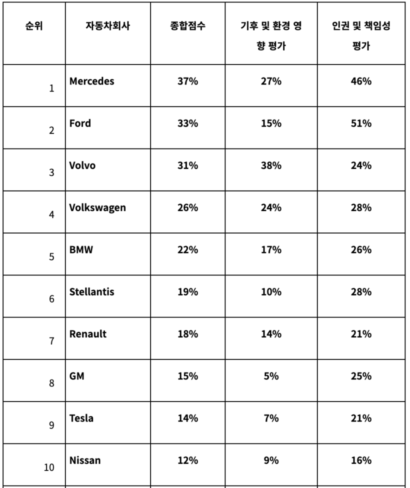 -한국 현대차, 기아차 각각 11위, 14위로 하위권 머물러…아동 노동 문제, 국내 철강 제조 과정에서 발생하는 대기오염 등 문제 지적