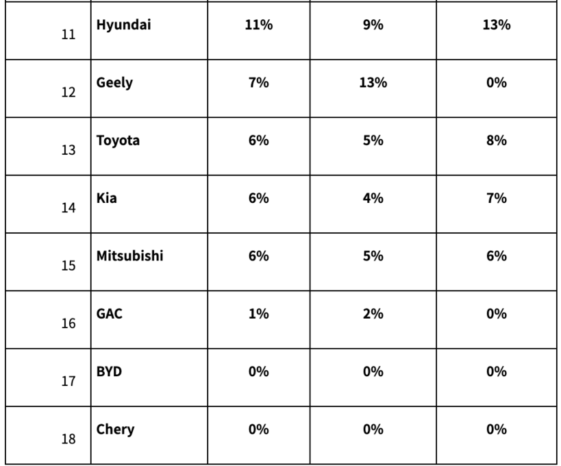 리더보드 보고서에 따르면 현대자동차는 100점 만점 기준 11점으로 전체 11위에 머문 것으로 나타났다. 기아는 6점으로 14위에 불과했다.
