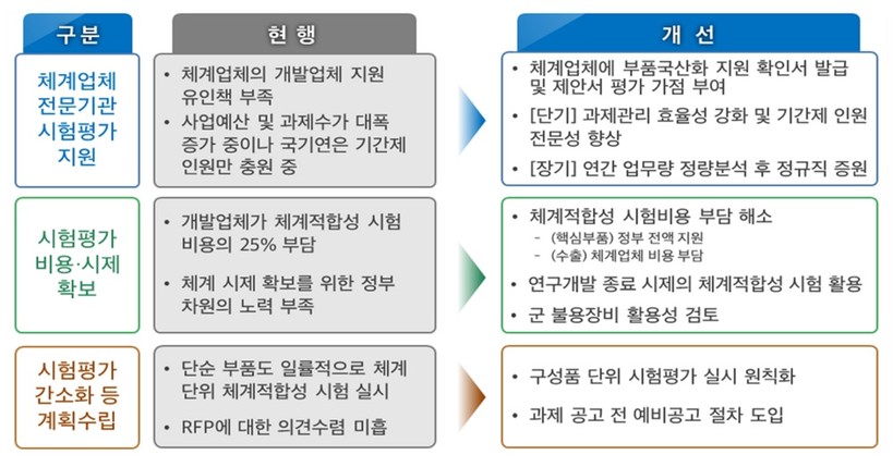 또 부품 상위 구성품 단위 시험을 원칙으로 하며 체계 장착 시험은 전문가가 참여한 위원회에서 필요하다고 인정할 때만 시행하도록 하는 등 중소기업의 비용 부담 완화와 효율적 사업 추진을 위한 개선을 추진한다.