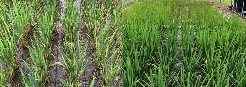 | ▲ 염해를 받은 벼(왼쪽)와 정상 생육 중인 벼(오른쪽). (사진=농촌진흥청) |