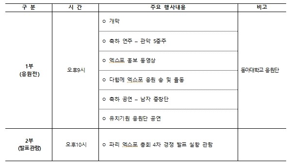 이 행사는 2030부산세계박람회 유치 범여성추진협의회, (사)2030부산월드엑스포 범시민서포터즈, 2030부산월드엑스포 시민참여연합에서 공동 주최하며, 누구나 참여해 동아대학교 응원단의 유치기원 공연과 4차 경쟁 프레젠테이션 실황을 관람할 수 있다.