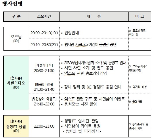 [일요주간 = 김영란 기자] 부산시(시장 박형준)는 내일(20일) 오후 8시 30분 광안리해수욕장 백사장에서 2030세계박람회 유치 4차 경쟁 프레젠테이션(PT)을 실시간으로 응원하는 ‘해변라디오 엑스포 2030’ 캠페인을 개최한다고 밝혔다.