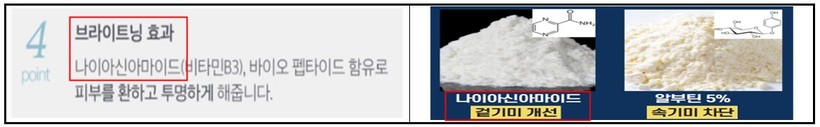 그러나 3개 제품은 ‘브라이트닝 효과 나이아신아마이드’, ‘나이아신아마이드 겉기미 개선’과 같이 식약처의 심사를 받지 않은 기능성 원료와 효능을 함께 광고하고 있었다.