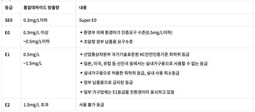 일반적으로 실내용 가구에 사용되는 목재의 친환경 등급은 SE0등급과 E0등급이다. 두 등급은 환경부 자재 친환경마크 인증요구 수준이고 조달철 정부 납품용으로 요구하는 기준이기도 하다. 다음 등급은 비환경 E1등급으로 산업통상자원부 국가기술표준원의 KC안전인증기준 최하위 등급이고 실내가구용으로 허용한 최하등급이기도 하다.