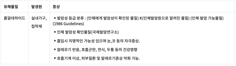 원목 가구를 제외한 일반적인 가구는 대부분 재활용 합판인 PB/MD를 사용한다. 목재의 작고 세밀한 조각(절삭 또는 파쇄조각), 톱밥 등을 주재료로 해 접착제를 섞어 고온/고압으로 압축해 제작한 판재다. 목재 중량 10%~20%의 접착제를 사용해 암을 유발하고 인체에 해로운 유해물질인 폼알데하이드가 다량 방출된다.