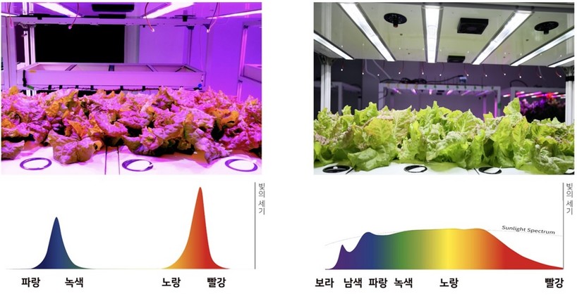| ▲ 왼쪽부터 물 먹이는 소 같은 식물재배와 태양광 스펙트럼 근접 재배. (사진=서울반도체) |