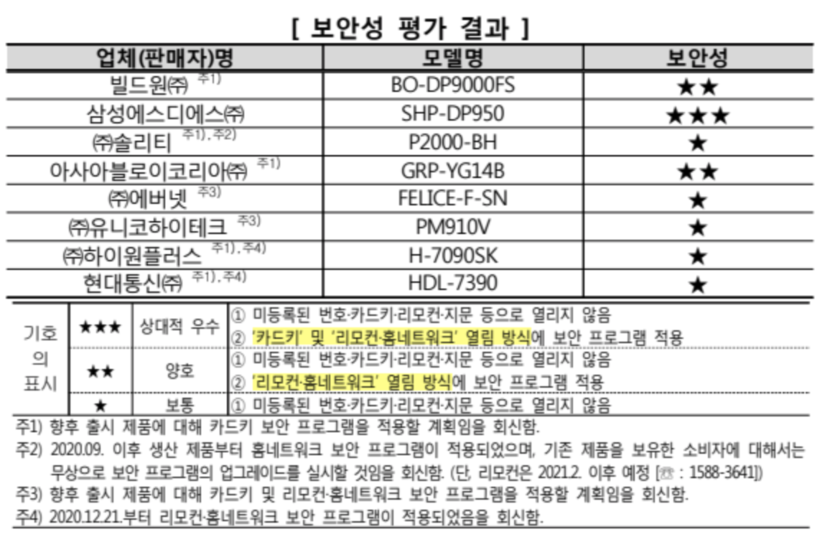 보안성에서는 시험대상 모든 제품이 등록되지 않은 카드키와 지문, 스마트폰 등으로 열리거나 오작동은 발생하지 않았다. 다만, 제품별로 리모컨·홈네트워크, 카드키에 적용된 보안 프로그램에서 차이를 보였다.