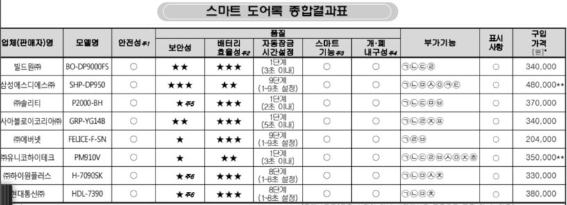 그러나 보안성(카드키, 리모컨·홈네트워크 열림 방식의 보안프로그램 적용), 배터리 효율성(건전지 교체 후 개·폐 가능 횟수) 항목에서는 제품별로 차이가 있었다.