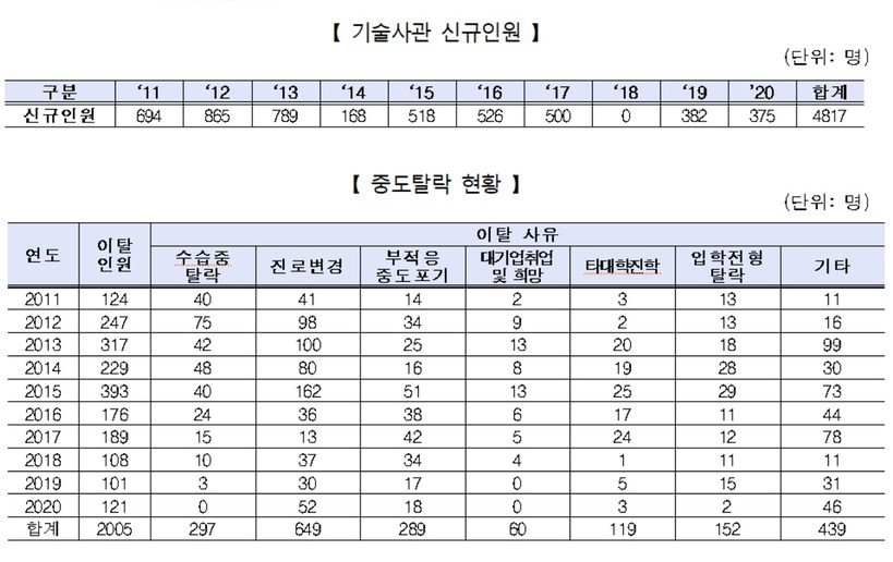 기술사관 42%가 중도에 포기한 셈이다. 중도탈락의 사유로는 ▲진로변경 649명 ▲수습중탈락 297명 ▲부적응중도포기 289명 ▲입학전형탈락 ▲타대학진학 ▲대기업취업 및 희망 순이다.