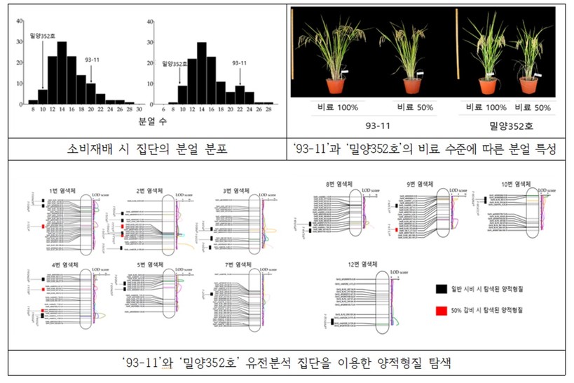 농진청은 인디카 자원(93-11)과 자포니카 계통(밀양352호)의 유전분석 집단에서 비료량을 줄였을 때도 분얼이 정상적으로 이루어지도록 유도하는 유전자 ‘qTN2-1’를 밝혀냈다.