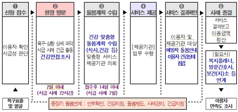 현재 시민들이 돌봄서비스를 신청하면 동주민센터의 돌봄매니저가 ①이용자의 상황과 욕구 파악 ②돌봄계획 수립 ③서비스 제공 등 절차로 진행하고 있는데, 오는 8월부터는 기존 절차에 대상자의 건강정보와 생활습관, 일상의 거동 불편 등의 내용을 확인할 수 있는 건강면접조사가 추가된다.