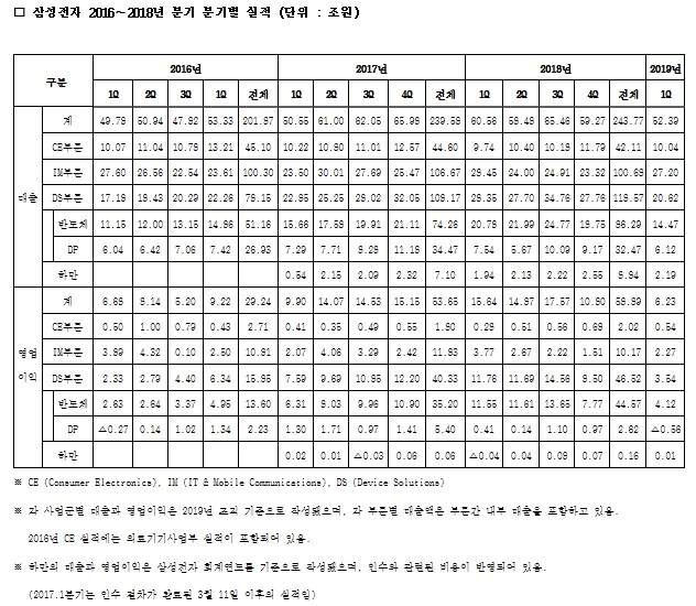 삼성전자에 따르면 1분기에는 메모리와 디스플레이 패널 사업 중심으로 수요 약세와 판가 하락 영향을 받아 매출은 전년 동기 대비 약 14% 감소한 52조4000억원을 기록했다.