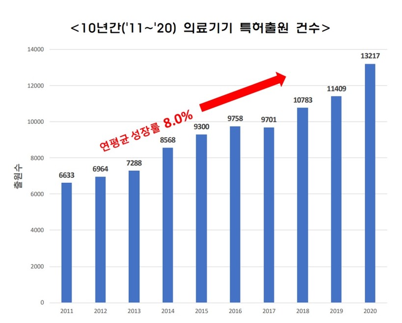 1일 특허청에 따르면 전체 특허출원이 지난 10년간(2011~2020년) 연평균 2.2%로 증가하는 동안 의료기기 분야 특허출원은 8.0%나 늘었다.