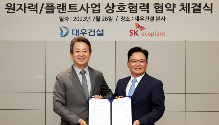 [일요주간 = 이수근 기자] 대우건설(대표이사 백정완)은 지난 26일 서울시 을지로 대우건설 본사에서 SK에코플랜트(대표이사 박경일)와 국내외 원전 및 플랜트 시장 진출 공동협력을 위한 업무협약(MOU)를 체결했다고 27일 밝혔다.