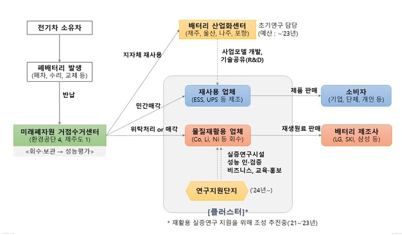 거점수거센터는 전기자동차 소유자가 정부에 반납하는 폐배터리를 회수해 남은 용량과 수명 등 잔존가치를 측정해 민간에 매각하는 등 재활용체계의 유통기반 역할을 수행한다.