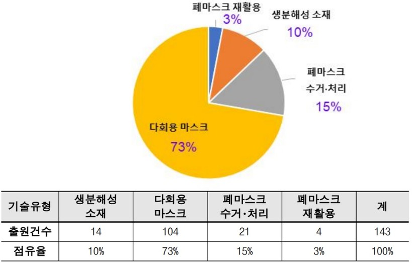 기술별 출원 비중을 보면 ▲생분해성 소재 14건(10%) ▲다회용 마스크 104건(73%) ▲폐마스크 수거‧처리 21건(15%) ▲폐마스크 재활용 4건(3%)인 것으로 분석됐다.