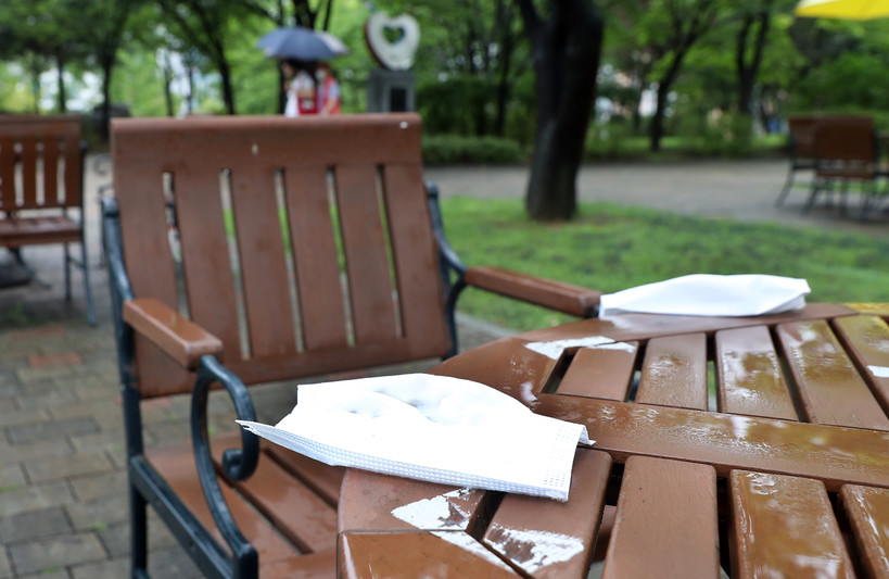 | ▲공원 야외용 테이블에 마스크가 버려져 있다.(사진=newsis) |