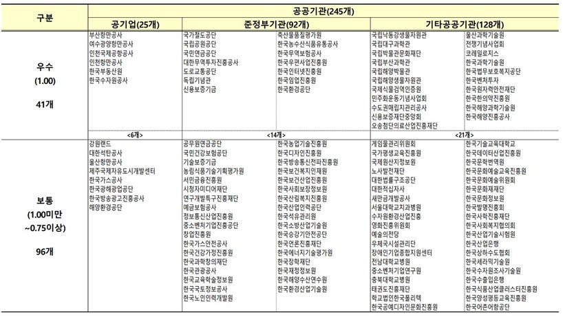 조사 대상 사업의 50% 이상에서 목표치를 달성(달성도 점수 0.75 이상 1.00 미만)한 96곳(공기업 8곳·준정부 35곳·기타 53곳)은 보통 기관으로 분류됐다.