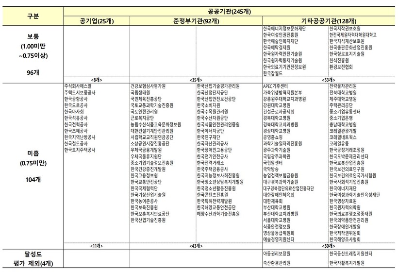 조사 대상 사업의 50% 미만에서 목표치를 달성(달성도 점수 0.75 미만)한 104곳(공기업 11곳·준정부 43곳·기타 50곳)은 미흡 기관으로 분류됐다.