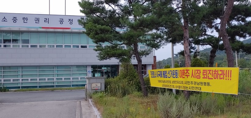| ▲사진=남원시민사회단체연대가 내건 이환주 시장 퇴진촉구 현수막이 남원시선거관위원회 앞에 게첨되어 있다. |