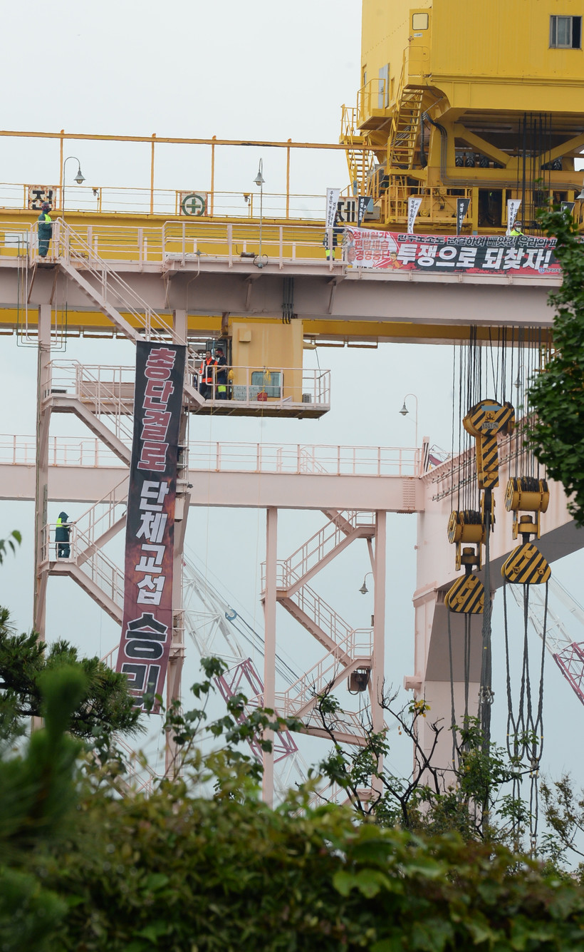 | ▲울산 동구 현대중공업 노조가 지난 6일 2년치 임단협 마무리를 촉구하며 일부 조합원들이 울산 본사 턴오버 크레인을 점거한 뒤 고공농성을 벌이고 있다.(사진=newsis) |