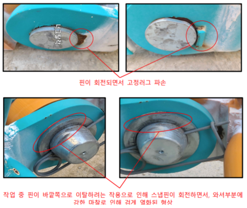 이에 대해 경실련은 “핀의 공차는 제조사에서 안전 설계기준에 따라 제작돼야 한다. 그러나 핀의 유동이 이탈로 이어져 지브가 추락·붕괴되는 사고가 ED 325L-18 및 CCTL, FT(중국제) 등에서 발생했고 일부 기종은 사람의 목숨을 앗아가는 중대 재해로 이어졌다”면서 “경실련 시민안전위원회에 타워크레인 안전 관련 제보중 최근 현장 종료 후 해체되는 ED325L -18 동일 기종에서 발견된 같은 위치의 지브 핀에서도 작업 중 이탈 전조 현상으로 와셔부분에 회전 이탈되려는 압력이 가해져 고정러그 파손과 함께 와셔 부분에서 마찰로 인한 형상이 다수 발견됐음이 사진과 영상으로 제보됐다”고 밝혔다.
