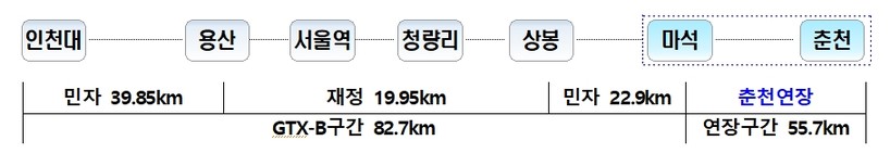 GTX-B 춘천연장 사업은 기존 경춘선 선로를 공용하여 GTX-B노선의 종점을 마석역에서 춘천역까지 55.7km연장하는 사업이다.