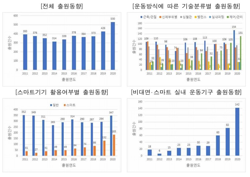 특히 비대면‧스마트 실내 운동기구는 2011년부터 2017년까지 매년 20건 안팎에서, 2018년 60건, 2019년 82건으로 출원이 3~4배 증가하다가 지난해 142건으로 7배 이상 증가했다.