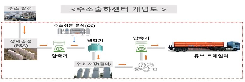 수소출하센터는 수소생산공장에서 생산된 수소를 저장하고 수소 전용 특수차량인 튜브트레일러에 적재해 수소충전소에 공급하는 역할을 하는 곳이다.