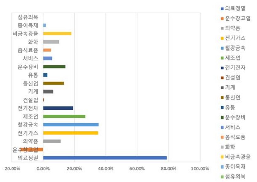 [일요주간 = 이수근 기자] 신종 코로나바이러스 감염증(코로나19) 대유행으로 최대 수혜를 본 업종은 ‘의료·정밀’로 조사됐다.