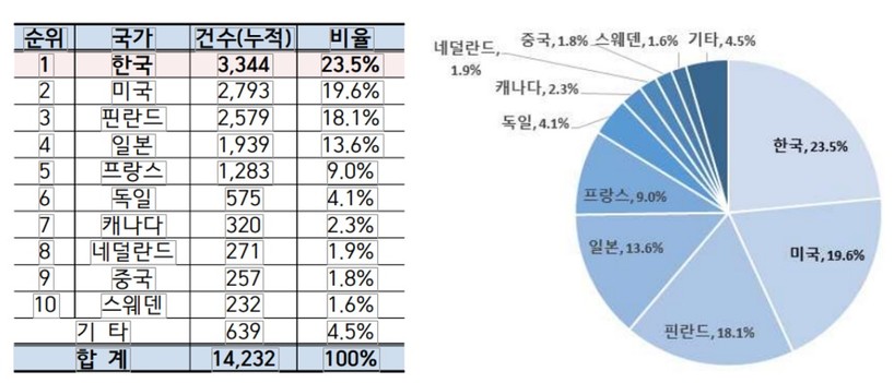 한국은 2016년 519건(세계 5위)보다 약 6.4배 증가한 3344건(23.5%)으로 가장 많았다. 이어 미국 2793건(19.6%), 핀란드 2579건(18.1%), 일본 1939건(13.6%), 프랑스 1283건(9.0%) 등이 뒤따랐다.