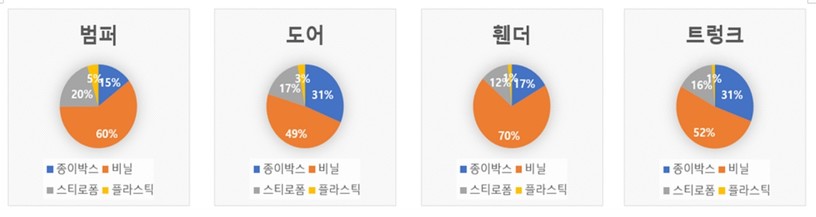 비닐과 마찬가지로 환경을 오염시키는 스티로폼 포장재도 범퍼 20%, 도어 17%, 트렁크 16%, 휀더 12%가 사용됐다.
